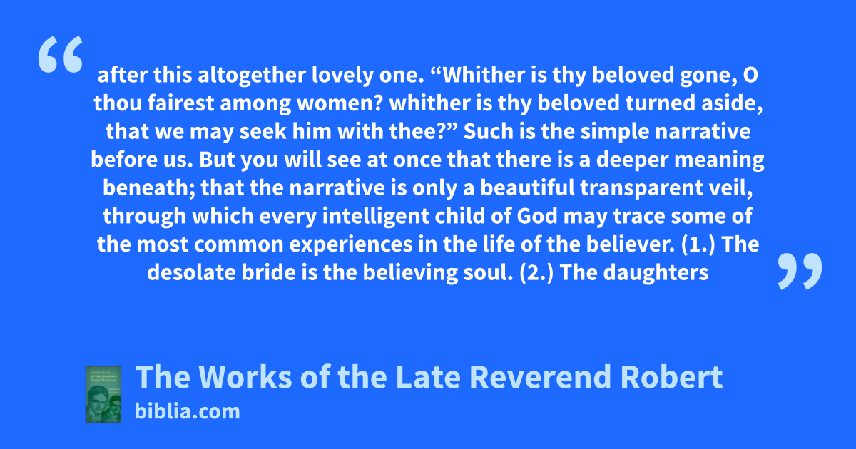 after this altogether lovely one. “Whither is thy beloved gone, O thou fairest among women? whither is thy beloved turned aside, that we may seek him with thee?” Such is the simple narrative before us. But you will see at once that there is a deeper meaning beneath; that the narrative is only a beautiful transparent veil, through which every intelligent child of God may trace some of the most common experiences in the life of the believer. (1.) The desolate bride is the believing soul. (2.) The daughters