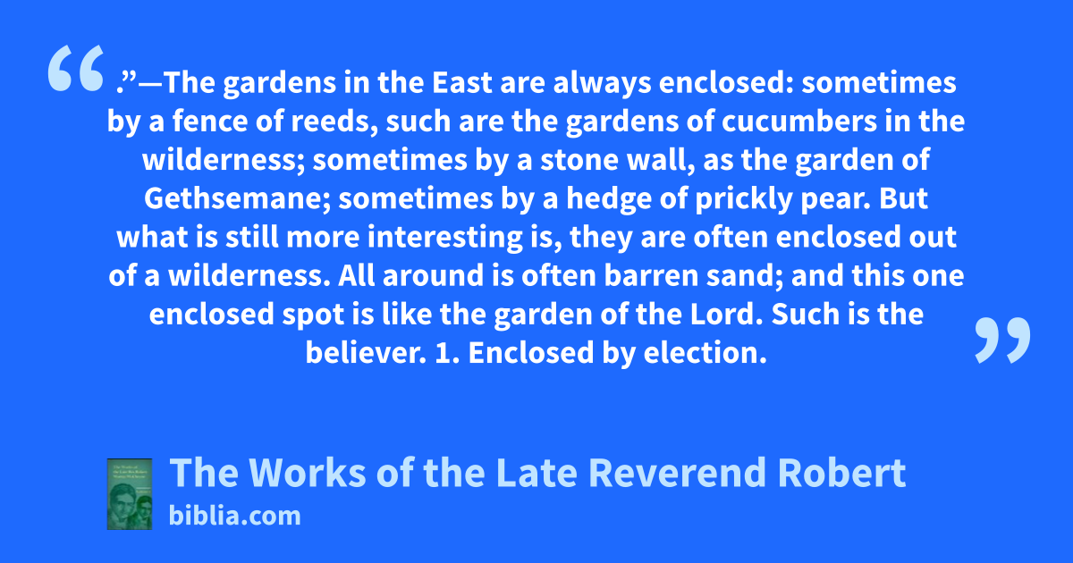 .”—The gardens in the East are always enclosed: sometimes by a fence of reeds, such are the gardens of cucumbers in the wilderness; sometimes by a stone wall, as the garden of Gethsemane; sometimes by a hedge of prickly pear. But what is still more interesting is, they are often enclosed out of a wilderness. All around is often barren sand; and this one enclosed spot is like the garden of the Lord. Such is the believer. 1. Enclosed by election.