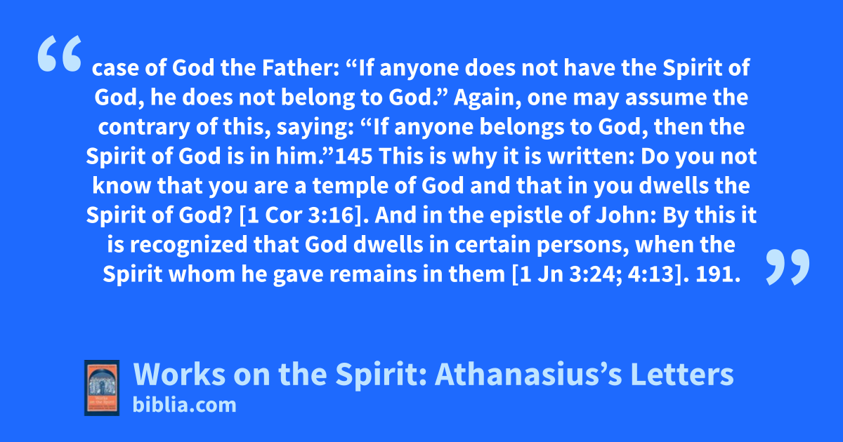 case of God the Father: “If anyone does not have the Spirit of God, he does not belong to God.” Again, one may assume the contrary of this, saying: “If anyone belongs to God, then the Spirit of God is in him.”145 This is why it is written: Do you not know that you are a temple of God and that in you dwells the Spirit of God? [1 Cor 3:16]. And in the epistle of John: By this it is recognized that God dwells in certain persons, when the Spirit whom he gave remains in them [1 Jn 3:24; 4:13]. 191.