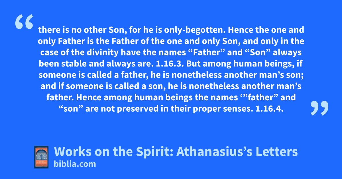 there is no other Son, for he is only-begotten. Hence the one and only Father is the Father of the one and only Son, and only in the case of the divinity have the names “Father” and “Son” always been stable and always are. 1.16.3. But among human beings, if someone is called a father, he is nonetheless another man’s son; and if someone is called a son, he is nonetheless another man’s father. Hence among human beings the names ‘”father” and “son” are not preserved in their proper senses. 1.16.4.