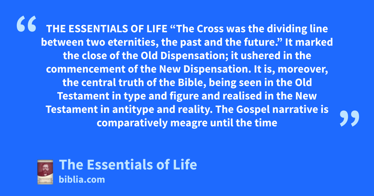 THE ESSENTIALS OF LIFE “The Cross was the dividing line between two eternities, the past and the future.” It marked the close of the Old Dispensation; it ushered in the commencement of the New Dispensation. It is, moreover, the central truth of the Bible, being seen in the Old Testament in type and figure and realised in the New Testament in antitype and reality. The Gospel narrative is comparatively meagre until the time