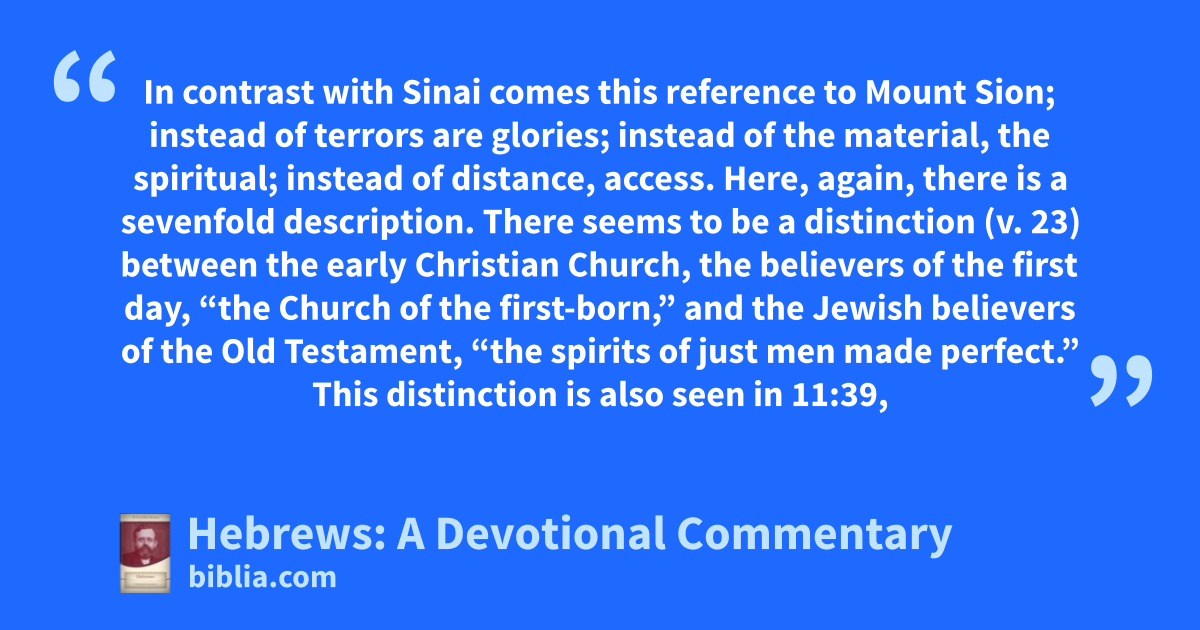 In contrast with Sinai comes this reference to Mount Sion; instead of terrors are glories; instead of the material, the spiritual; instead of distance, access. Here, again, there is a sevenfold description. There seems to be a distinction (v. 23) between the early Christian Church, the believers of the first day, “the Church of the first-born,” and the Jewish believers of the Old Testament, “the spirits of just men made perfect.” This distinction is also seen in 11:39,