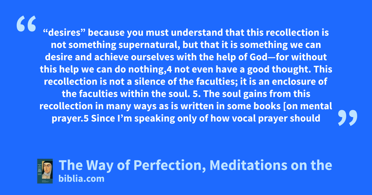 “desires” because you must understand that this recollection is not something supernatural, but that it is something we can desire and achieve ourselves with the help of God—for without this help we can do nothing,4 not even have a good thought. This recollection is not a silence of the faculties; it is an enclosure of the faculties within the soul. 5. The soul gains from this recollection in many ways as is written in some books [on mental prayer.5 Since I’m speaking only of how vocal prayer should
