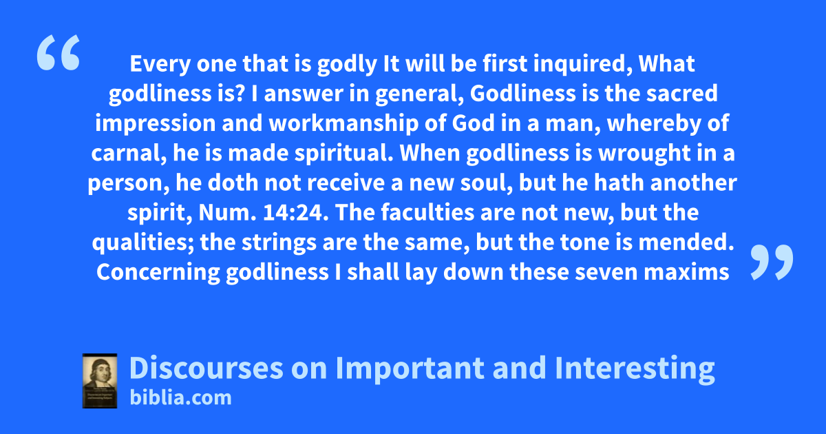 Every one that is godly It will be first inquired, What godliness is? I answer in general, Godliness is the sacred impression and workmanship of God in a man, whereby of carnal, he is made spiritual. When godliness is wrought in a person, he doth not receive a new soul, but he hath another spirit, Num. 14:24. The faculties are not new, but the qualities; the strings are the same, but the tone is mended. Concerning godliness I shall lay down these seven maxims