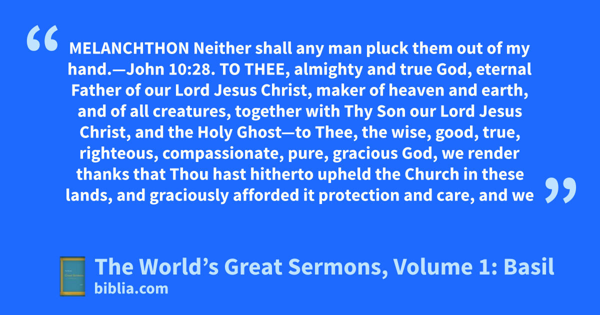 MELANCHTHON Neither shall any man pluck them out of my hand.—John 10:28. TO THEE, almighty and true God, eternal Father of our Lord Jesus Christ, maker of heaven and earth, and of all creatures, together with Thy Son our Lord Jesus Christ, and the Holy Ghost—to Thee, the wise, good, true, righteous, compassionate, pure, gracious God, we render thanks that Thou hast hitherto upheld the Church in these lands, and graciously afforded it protection and care, and we