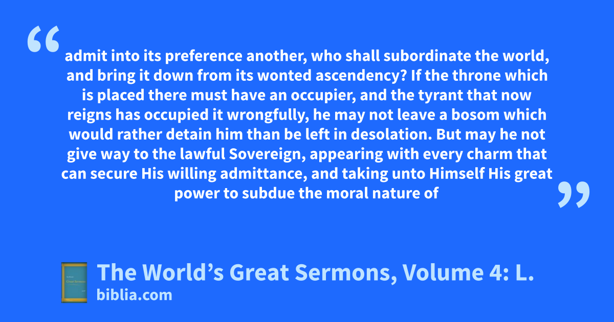 admit into its preference another, who shall subordinate the world, and bring it down from its wonted ascendency? If the throne which is placed there must have an occupier, and the tyrant that now reigns has occupied it wrongfully, he may not leave a bosom which would rather detain him than be left in desolation. But may he not give way to the lawful Sovereign, appearing with every charm that can secure His willing admittance, and taking unto Himself His great power to subdue the moral nature of