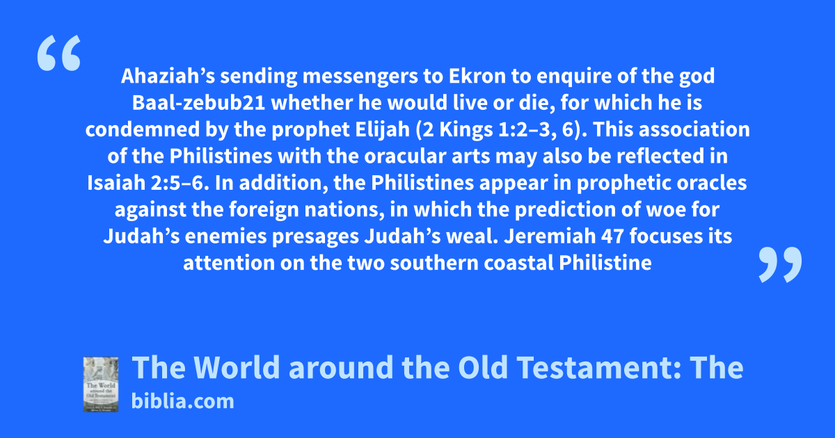 Ahaziah’s sending messengers to Ekron to enquire of the god Baal-zebub21 whether he would live or die, for which he is condemned by the prophet Elijah (2 Kings 1:2–3, 6). This association of the Philistines with the oracular arts may also be reflected in Isaiah 2:5–6. In addition, the Philistines appear in prophetic oracles against the foreign nations, in which the prediction of woe for Judah’s enemies presages Judah’s weal. Jeremiah 47 focuses its attention on the two southern coastal Philistine
