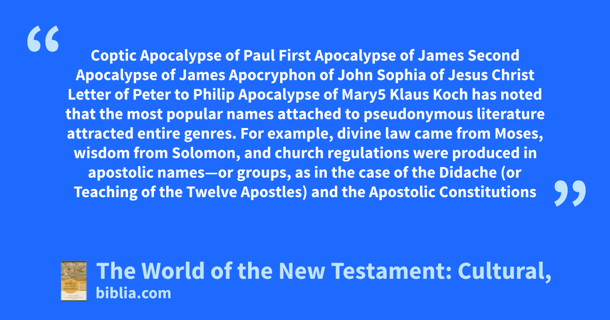 Coptic Apocalypse of Paul First Apocalypse of James Second Apocalypse of James Apocryphon of John Sophia of Jesus Christ Letter of Peter to Philip Apocalypse of Mary5 Klaus Koch has noted that the most popular names attached to pseudonymous literature attracted entire genres. For example, divine law came from Moses, wisdom from Solomon, and church regulations were produced in apostolic names—or groups, as in the case of the Didache (or Teaching of the Twelve Apostles) and the Apostolic Constitutions