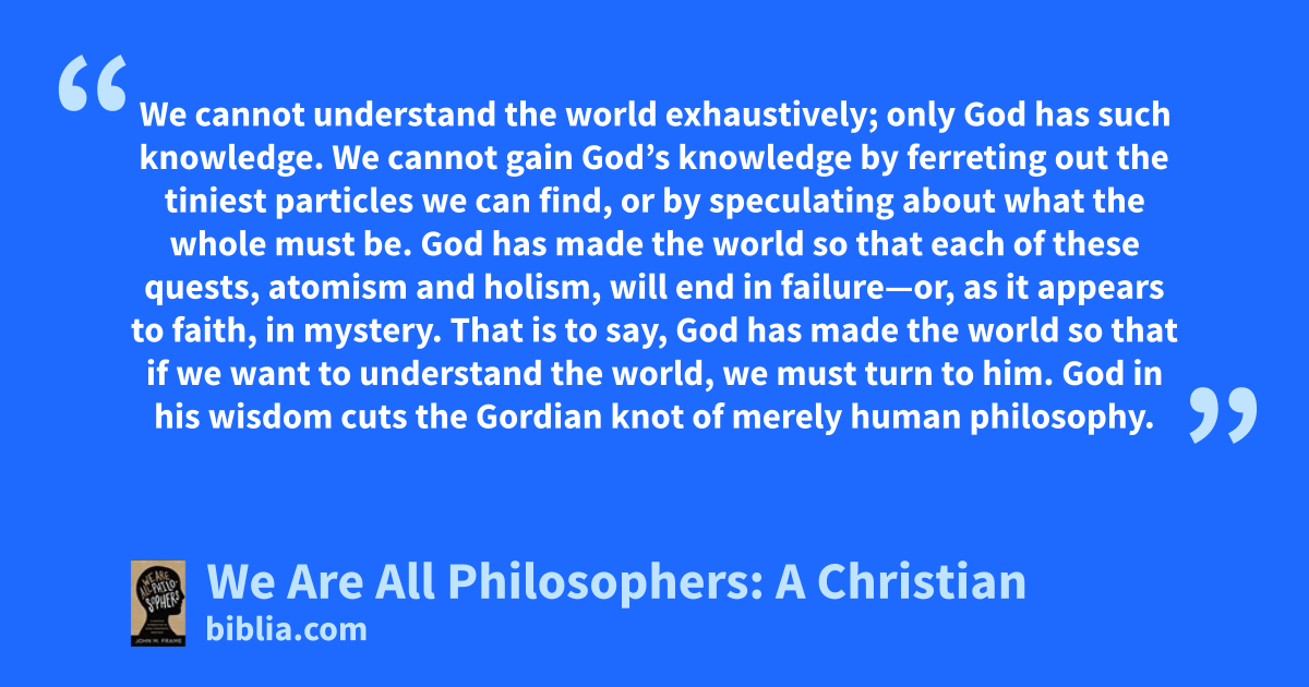 We cannot understand the world exhaustively; only God has such knowledge. We cannot gain God’s knowledge by ferreting out the tiniest particles we can find, or by speculating about what the whole must be. God has made the world so that each of these quests, atomism and holism, will end in failure—or, as it appears to faith, in mystery. That is to say, God has made the world so that if we want to understand the world, we must turn to him. God in his wisdom cuts the Gordian knot of merely human philosophy.
