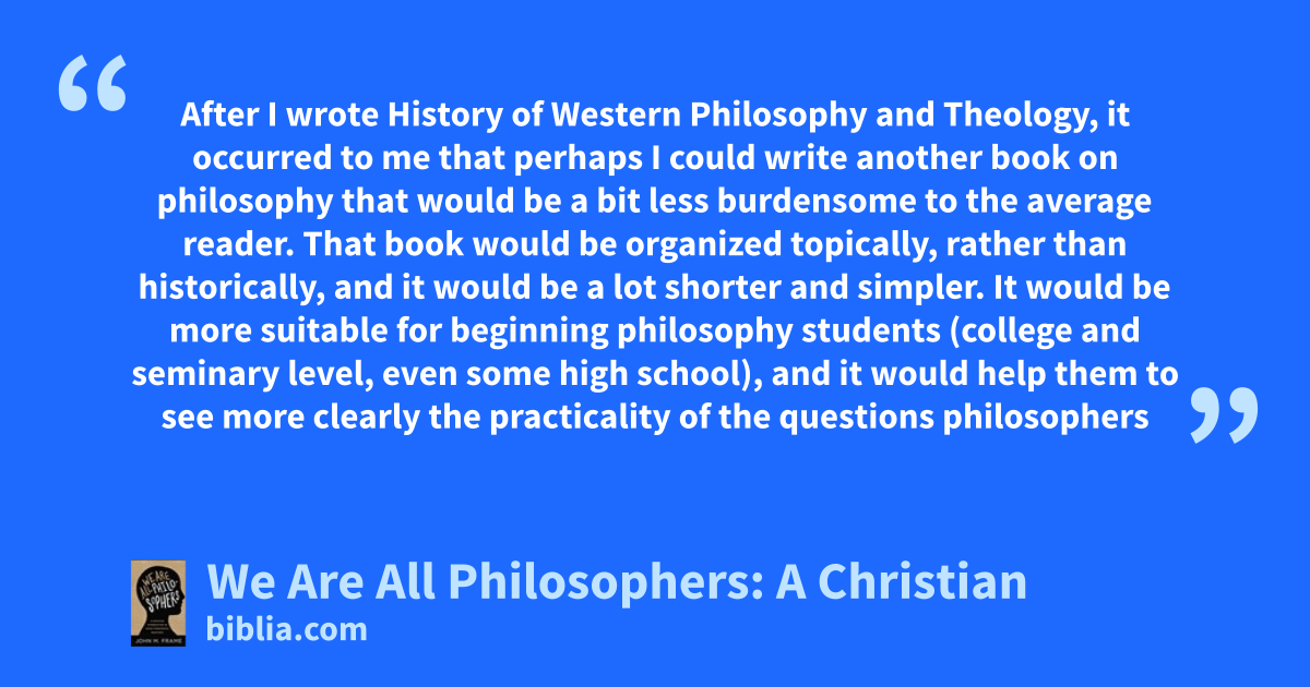 Everyone is a philosopher, and how we live reveals what we most deeply believe. If you and God were asked the same question, would you both respond in the same way? Are Christians right to believe what we do? In We Are All Philosophers, John M. Frame takes seven major questions of philosophy and compares the Bible’s answers with common philosophical ones: • What is everything made of? •...