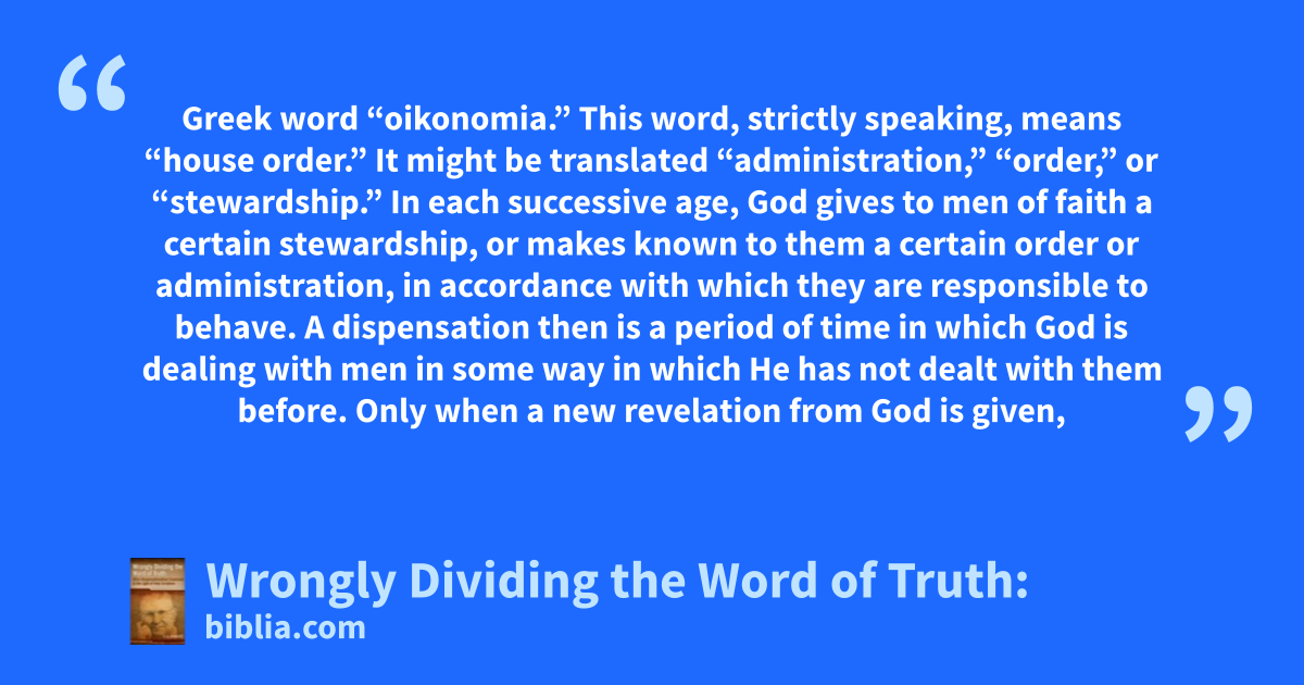 Greek word “oikonomia.” This word, strictly speaking, means “house order.” It might be translated “administration,” “order,” or “stewardship.” In each successive age, God gives to men of faith a certain stewardship, or makes known to them a certain order or administration, in accordance with which they are responsible to behave. A dispensation then is a period of time in which God is dealing with men in some way in which He has not dealt with them before. Only when a new revelation from God is given,