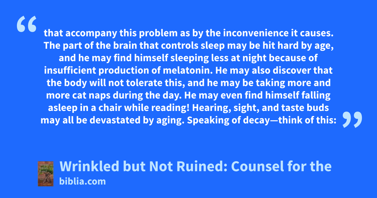 that accompany this problem as by the inconvenience it causes. The part of the brain that controls sleep may be hit hard by age, and he may find himself sleeping less at night because of insufficient production of melatonin. He may also discover that the body will not tolerate this, and he may be taking more and more cat naps during the day. He may even find himself falling asleep in a chair while reading! Hearing, sight, and taste buds may all be devastated by aging. Speaking of decay—think of this: