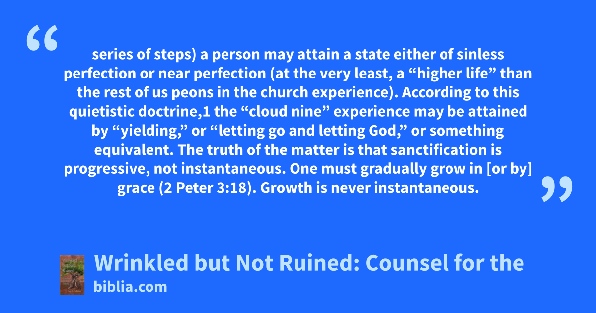 series of steps) a person may attain a state either of sinless perfection or near perfection (at the very least, a “higher life” than the rest of us peons in the church experience). According to this quietistic doctrine,1 the “cloud nine” experience may be attained by “yielding,” or “letting go and letting God,” or something equivalent. The truth of the matter is that sanctification is progressive, not instantaneous. One must gradually grow in [or by] grace (2 Peter 3:18). Growth is never instantaneous.