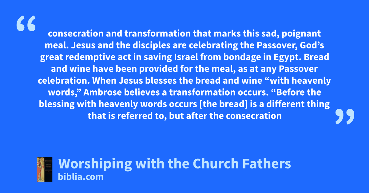 consecration and transformation that marks this sad, poignant meal. Jesus and the disciples are celebrating the Passover, God’s great redemptive act in saving Israel from bondage in Egypt. Bread and wine have been provided for the meal, as at any Passover celebration. When Jesus blesses the bread and wine “with heavenly words,” Ambrose believes a transformation occurs. “Before the blessing with heavenly words occurs [the bread] is a different thing that is referred to, but after the consecration