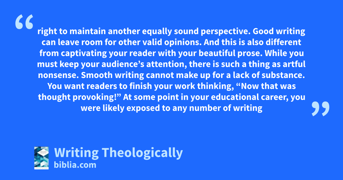 right to maintain another equally sound perspective. Good writing can leave room for other valid opinions. And this is also different from captivating your reader with your beautiful prose. While you must keep your audience’s attention, there is such a thing as artful nonsense. Smooth writing cannot make up for a lack of substance. You want readers to finish your work thinking, “Now that was thought provoking!” At some point in your educational career, you were likely exposed to any number of writing