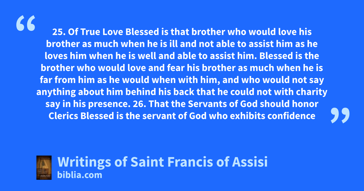 25. Of True Love Blessed is that brother who would love his brother as much when he is ill and not able to assist him as he loves him when he is well and able to assist him. Blessed is the brother who would love and fear his brother as much when he is far from him as he would when with him, and who would not say anything about him behind his back that he could not with charity say in his presence. 26. That the Servants of God should honor Clerics Blessed is the servant of God who exhibits confidence