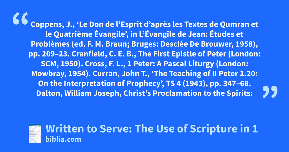 Coppens, J., ‘Le Don de l’Esprit d’après les Textes de Qumran et le Quatrième Évangile’, in L’Évangile de Jean: Études et Problèmes (ed. F. M. Braun; Bruges: Desclée De Brouwer, 1958), pp. 209–23. Cranfield, C. E. B., The First Epistle of Peter (London: SCM, 1950). Cross, F. L., 1 Peter: A Pascal Liturgy (London: Mowbray, 1954). Curran, John T., ‘The Teaching of II Peter 1.20: On the Interpretation of Prophecy’, TS 4 (1943), pp. 347–68. Dalton, William Joseph, Christ’s Proclamation to the Spirits: