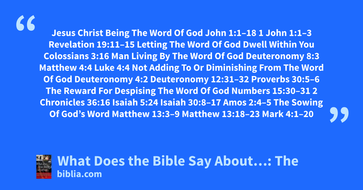 Jesus Christ Being The Word Of God John 1:1–18 1 John 1:1–3 Revelation 19:11–15 Letting The Word Of God Dwell Within You Colossians 3:16 Man Living By The Word Of God Deuteronomy 8:3 Matthew 4:4 Luke 4:4 Not Adding To Or Diminishing From The Word Of God Deuteronomy 4:2 Deuteronomy 12:31–32 Proverbs 30:5–6 The Reward For Despising The Word Of God Numbers 15:30–31 2 Chronicles 36:16 Isaiah 5:24 Isaiah 30:8–17 Amos 2:4–5 The Sowing Of God’s Word Matthew 13:3–9 Matthew 13:18–23 Mark 4:1–20