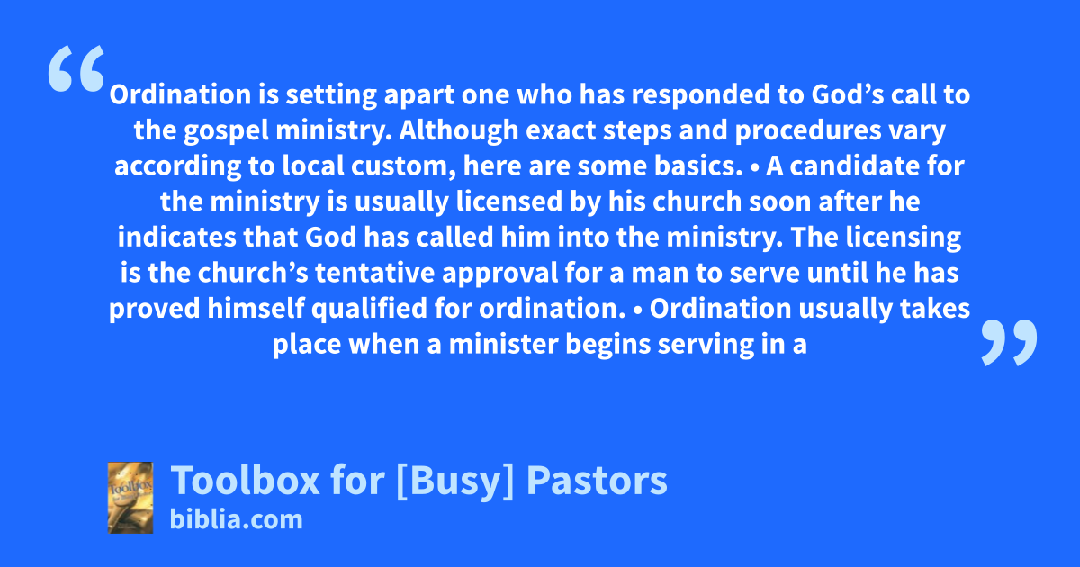 Ordination is setting apart one who has responded to God’s call to the gospel ministry. Although exact steps and procedures vary according to local custom, here are some basics. • A candidate for the ministry is usually licensed by his church soon after he indicates that God has called him into the ministry. The licensing is the church’s tentative approval for a man to serve until he has proved himself qualified for ordination. • Ordination usually takes place when a minister begins serving in a