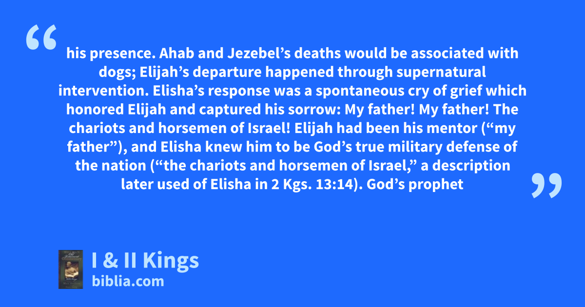 his presence. Ahab and Jezebel’s deaths would be associated with dogs; Elijah’s departure happened through supernatural intervention. Elisha’s response was a spontaneous cry of grief which honored Elijah and captured his sorrow: My father! My father! The chariots and horsemen of Israel! Elijah had been his mentor (“my father”), and Elisha knew him to be God’s true military defense of the nation (“the chariots and horsemen of Israel,” a description later used of Elisha in 2 Kgs. 13:14). God’s prophet