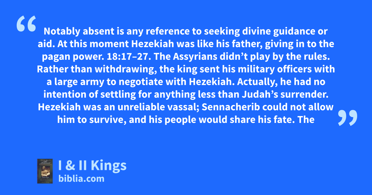 Notably absent is any reference to seeking divine guidance or aid. At this moment Hezekiah was like his father, giving in to the pagan power. 18:17–27. The Assyrians didn’t play by the rules. Rather than withdrawing, the king sent his military officers with a large army to negotiate with Hezekiah. Actually, he had no intention of settling for anything less than Judah’s surrender. Hezekiah was an unreliable vassal; Sennacherib could not allow him to survive, and his people would share his fate. The