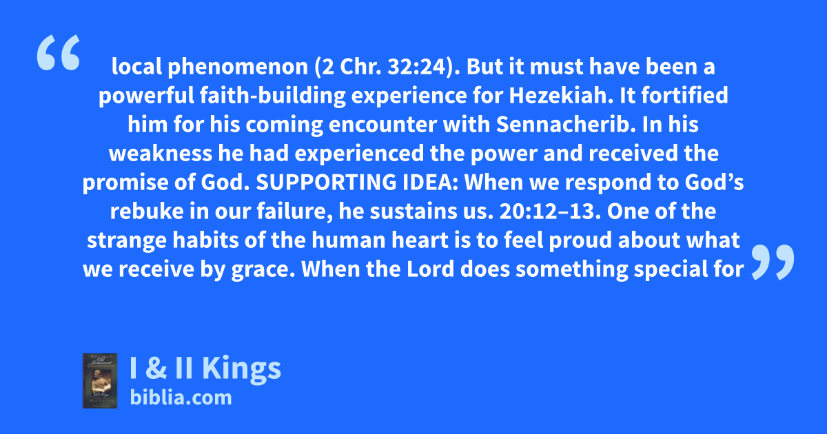 local phenomenon (2 Chr. 32:24). But it must have been a powerful faith-building experience for Hezekiah. It fortified him for his coming encounter with Sennacherib. In his weakness he had experienced the power and received the promise of God. SUPPORTING IDEA: When we respond to God’s rebuke in our failure, he sustains us. 20:12–13. One of the strange habits of the human heart is to feel proud about what we receive by grace. When the Lord does something special for