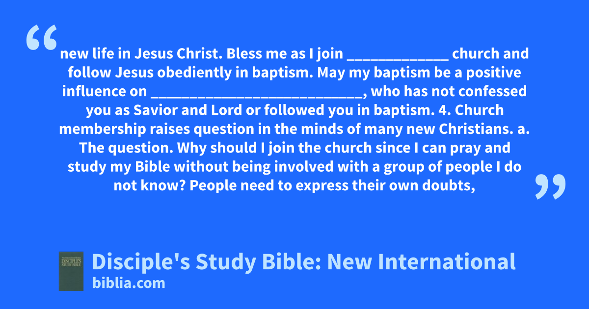 new life in Jesus Christ. Bless me as I join _____________ church and follow Jesus obediently in baptism. May my baptism be a positive influence on ___________________________, who has not confessed you as Savior and Lord or followed you in baptism. 4. Church membership raises question in the minds of many new Christians. a. The question. Why should I join the church since I can pray and study my Bible without being involved with a group of people I do not know? People need to express their own doubts,