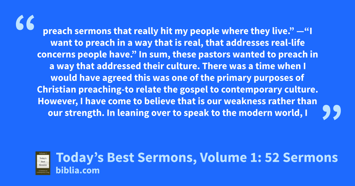 preach sermons that really hit my people where they live.” —“I want to preach in a way that is real, that addresses real-life concerns people have.” In sum, these pastors wanted to preach in a way that addressed their culture. There was a time when I would have agreed this was one of the primary purposes of Christian preaching-to relate the gospel to contemporary culture. However, I have come to believe that is our weakness rather than our strength. In leaning over to speak to the modern world, I