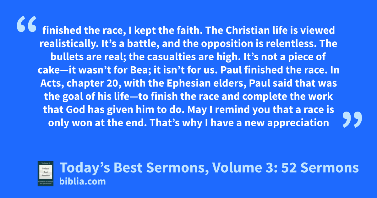 finished the race, I kept the faith. The Christian life is viewed realistically. It’s a battle, and the opposition is relentless. The bullets are real; the casualties are high. It’s not a piece of cake—it wasn’t for Bea; it isn’t for us. Paul finished the race. In Acts, chapter 20, with the Ephesian elders, Paul said that was the goal of his life—to finish the race and complete the work that God has given him to do. May I remind you that a race is only won at the end. That’s why I have a new appreciation