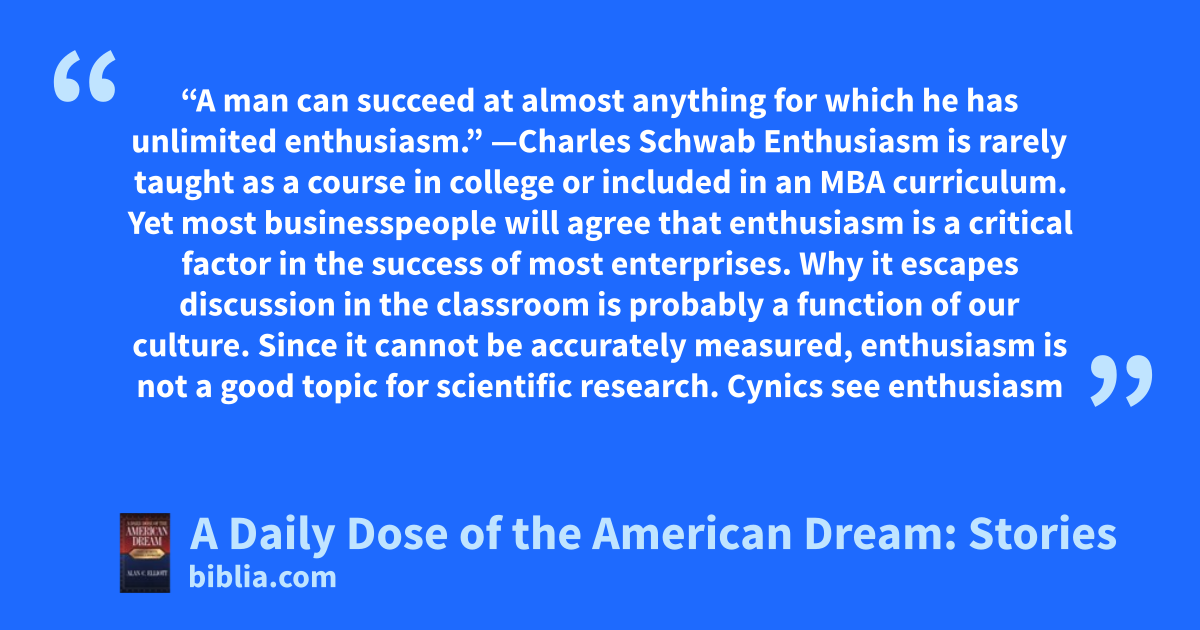 “A man can succeed at almost anything for which he has unlimited enthusiasm.” —Charles Schwab Enthusiasm is rarely taught as a course in college or included in an MBA curriculum. Yet most businesspeople will agree that enthusiasm is a critical factor in the success of most enterprises. Why it escapes discussion in the classroom is probably a function of our culture. Since it cannot be accurately measured, enthusiasm is not a good topic for scientific research. Cynics see enthusiasm