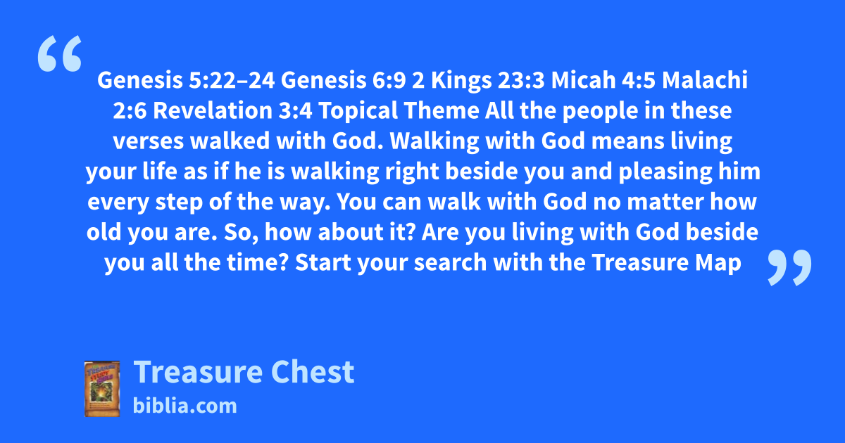 Genesis 5:22–24 Genesis 6:9 2 Kings 23:3 Micah 4:5 Malachi 2:6 Revelation 3:4 Topical Theme All the people in these verses walked with God. Walking with God means living your life as if he is walking right beside you and pleasing him every step of the way. You can walk with God no matter how old you are. So, how about it? Are you living with God beside you all the time? Start your search with the Treasure Map