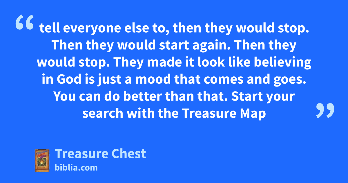 tell everyone else to, then they would stop. Then they would start again. Then they would stop. They made it look like believing in God is just a mood that comes and goes. You can do better than that. Start your search with the Treasure Map