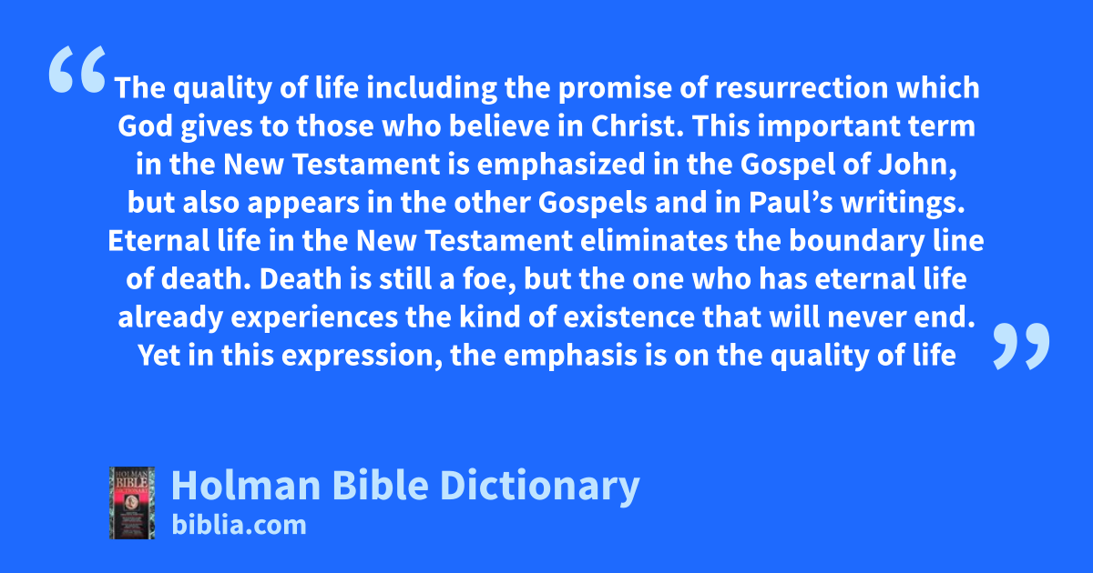 The quality of life including the promise of resurrection which God gives to those who believe in Christ. This important term in the New Testament is emphasized in the Gospel of John, but also appears in the other Gospels and in Paul’s writings. Eternal life in the New Testament eliminates the boundary line of death. Death is still a foe, but the one who has eternal life already experiences the kind of existence that will never end. Yet in this expression, the emphasis is on the quality of life