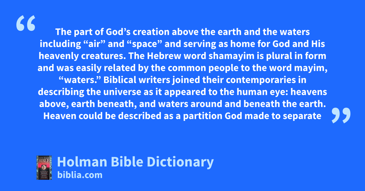 The part of God’s creation above the earth and the waters including “air” and “space” and serving as home for God and His heavenly creatures. The Hebrew word shamayim is plural in form and was easily related by the common people to the word mayim, “waters.” Biblical writers joined their contemporaries in describing the universe as it appeared to the human eye: heavens above, earth beneath, and waters around and beneath the earth. Heaven could be described as a partition God made to separate