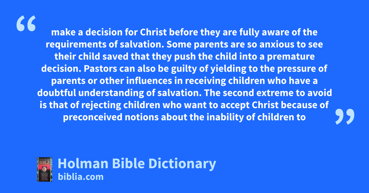 make a decision for Christ before they are fully aware of the requirements of salvation. Some parents are so anxious to see their child saved that they push the child into a premature decision. Pastors can also be guilty of yielding to the pressure of parents or other influences in receiving children who have a doubtful understanding of salvation. The second extreme to avoid is that of rejecting children who want to accept Christ because of preconceived notions about the inability of children to
