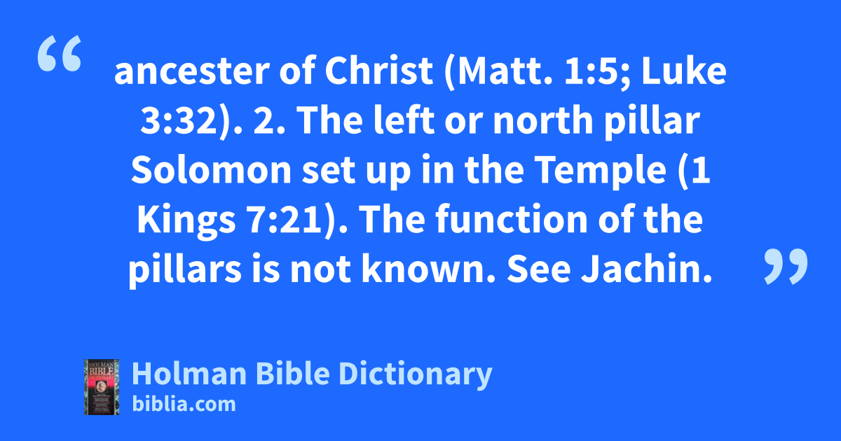 ancester of Christ (Matt. 1:5; Luke 3:32). 2. The left or north pillar Solomon set up in the Temple (1 Kings 7:21). The function of the pillars is not known. See Jachin.