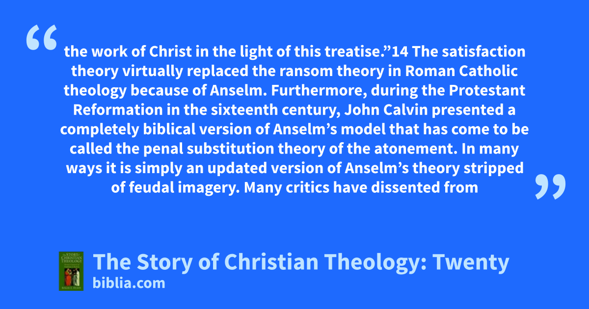 the work of Christ in the light of this treatise.”14 The satisfaction theory virtually replaced the ransom theory in Roman Catholic theology because of Anselm. Furthermore, during the Protestant Reformation in the sixteenth century, John Calvin presented a completely biblical version of Anselm’s model that has come to be called the penal substitution theory of the atonement. In many ways it is simply an updated version of Anselm’s theory stripped of feudal imagery. Many critics have dissented from