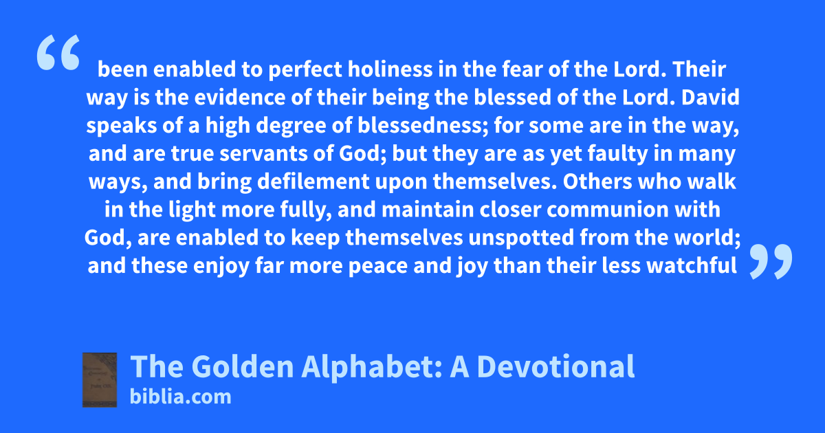 been enabled to perfect holiness in the fear of the Lord. Their way is the evidence of their being the blessed of the Lord. David speaks of a high degree of blessedness; for some are in the way, and are true servants of God; but they are as yet faulty in many ways, and bring defilement upon themselves. Others who walk in the light more fully, and maintain closer communion with God, are enabled to keep themselves unspotted from the world; and these enjoy far more peace and joy than their less watchful