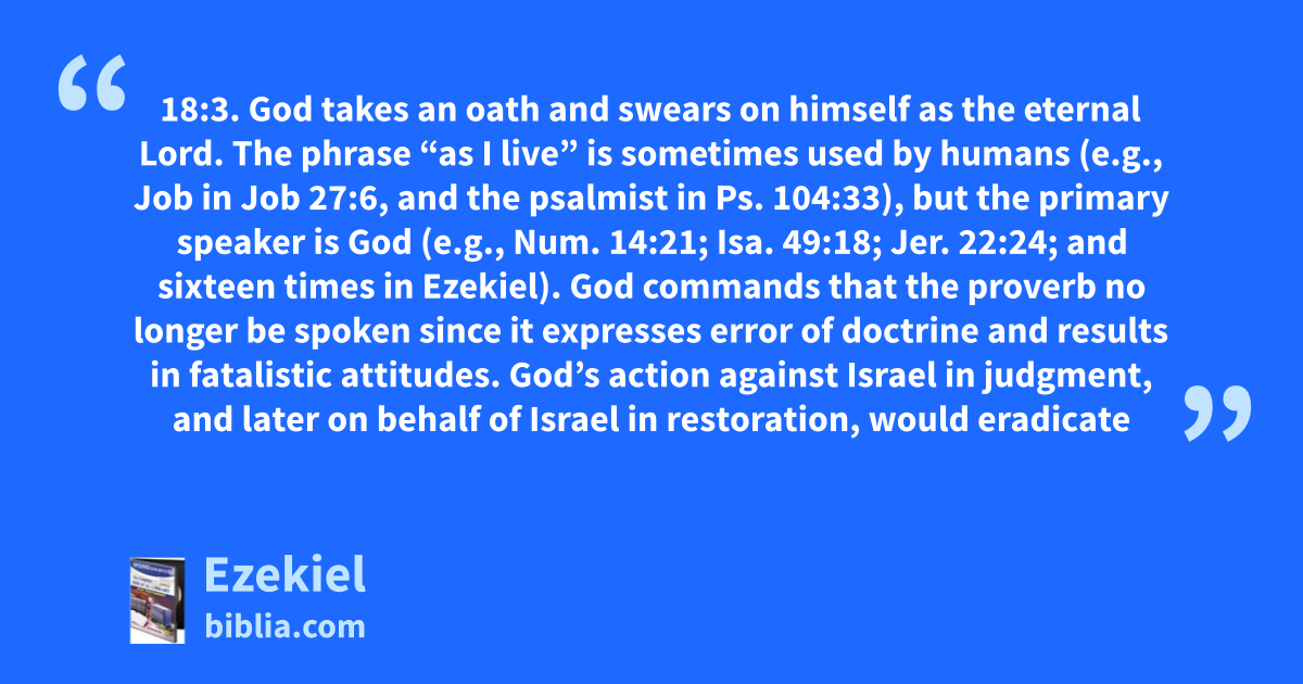 18:3. God takes an oath and swears on himself as the eternal Lord. The phrase “as I live” is sometimes used by humans (e.g., Job in Job 27:6, and the psalmist in Ps. 104:33), but the primary speaker is God (e.g., Num. 14:21; Isa. 49:18; Jer. 22:24; and sixteen times in Ezekiel). God commands that the proverb no longer be spoken since it expresses error of doctrine and results in fatalistic attitudes. God’s action against Israel in judgment, and later on behalf of Israel in restoration, would eradicate