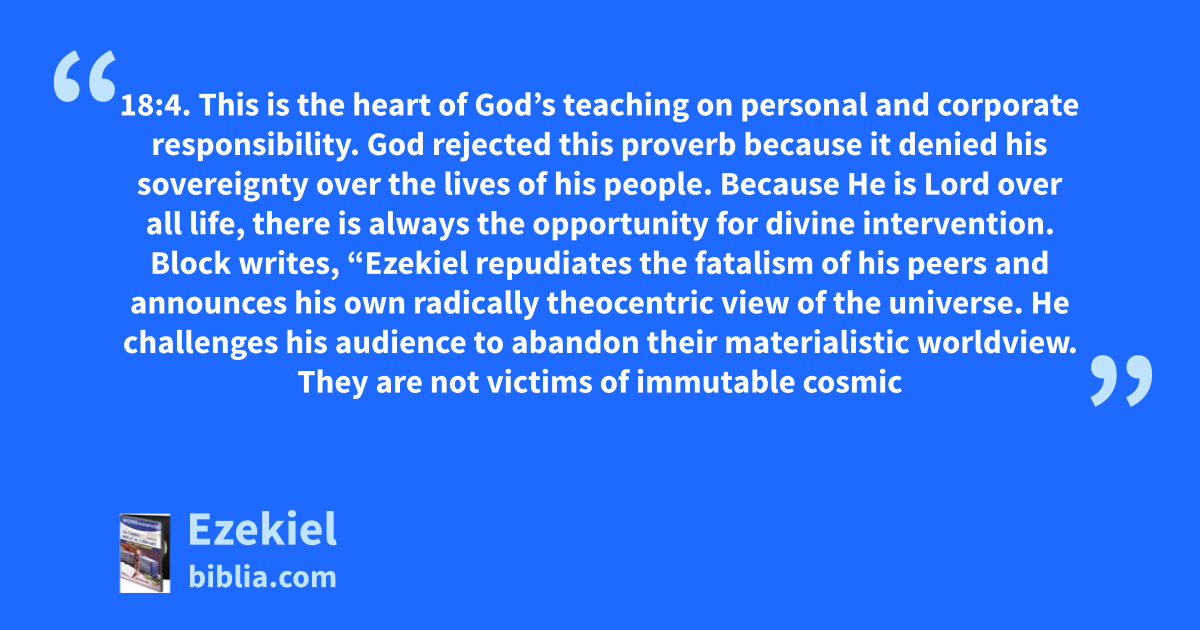 18:4. This is the heart of God’s teaching on personal and corporate responsibility. God rejected this proverb because it denied his sovereignty over the lives of his people. Because He is Lord over all life, there is always the opportunity for divine intervention. Block writes, “Ezekiel repudiates the fatalism of his peers and announces his own radically theocentric view of the universe. He challenges his audience to abandon their materialistic worldview. They are not victims of immutable cosmic
