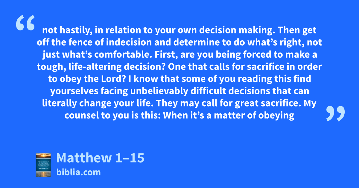 not hastily, in relation to your own decision making. Then get off the fence of indecision and determine to do what’s right, not just what’s comfortable. First, are you being forced to make a tough, life-altering decision? One that calls for sacrifice in order to obey the Lord? I know that some of you reading this find yourselves facing unbelievably difficult decisions that can literally change your life. They may call for great sacrifice. My counsel to you is this: When it’s a matter of obeying