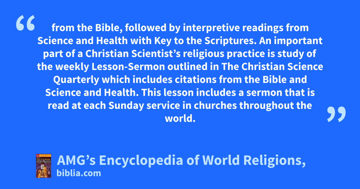 from the Bible, followed by interpretive readings from Science and Health with Key to the Scriptures. An important part of a Christian Scientist’s religious practice is study of the weekly Lesson-Sermon outlined in The Christian Science Quarterly which includes citations from the Bible and Science and Health. This lesson includes a sermon that is read at each Sunday service in churches throughout the world.