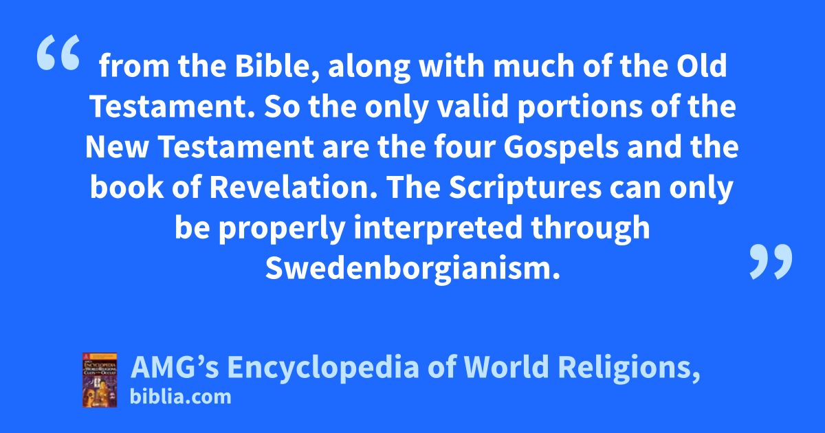 from the Bible, along with much of the Old Testament. So the only valid portions of the New Testament are the four Gospels and the book of Revelation. The Scriptures can only be properly interpreted through Swedenborgianism.