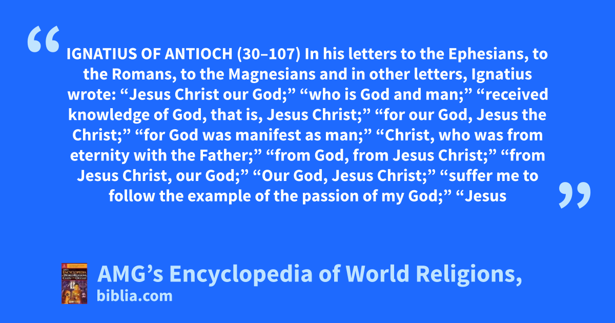 IGNATIUS OF ANTIOCH (30–107) In his letters to the Ephesians, to the Romans, to the Magnesians and in other letters, Ignatius wrote: “Jesus Christ our God;” “who is God and man;” “received knowledge of God, that is, Jesus Christ;” “for our God, Jesus the Christ;” “for God was manifest as man;” “Christ, who was from eternity with the Father;” “from God, from Jesus Christ;” “from Jesus Christ, our God;” “Our God, Jesus Christ;” “suffer me to follow the example of the passion of my God;” “Jesus