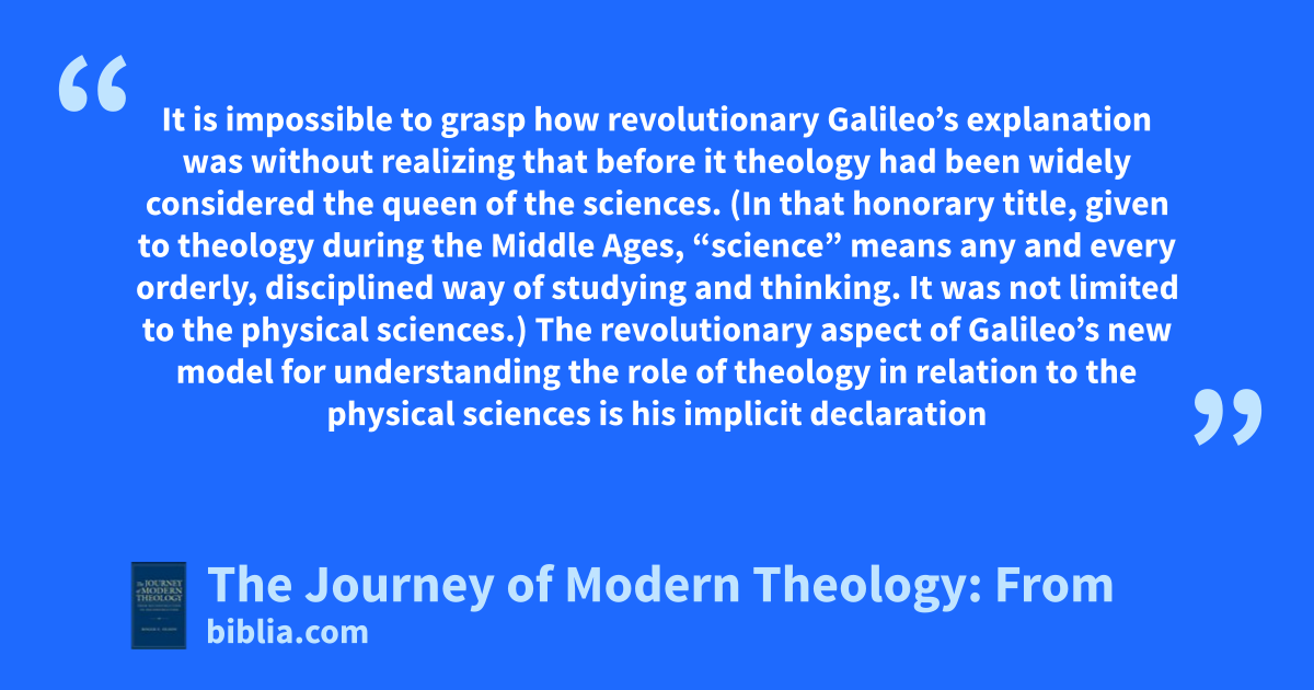 It is impossible to grasp how revolutionary Galileo’s explanation was without realizing that before it theology had been widely considered the queen of the sciences. (In that honorary title, given to theology during the Middle Ages, “science” means any and every orderly, disciplined way of studying and thinking. It was not limited to the physical sciences.) The revolutionary aspect of Galileo’s new model for understanding the role of theology in relation to the physical sciences is his implicit declaration