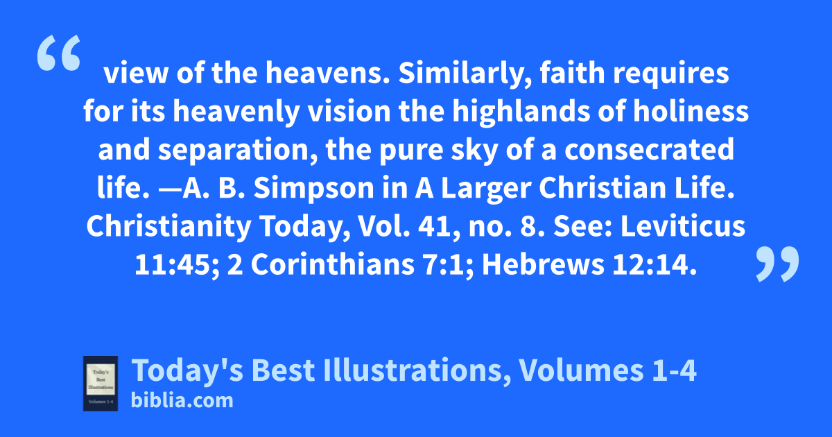 view of the heavens. Similarly, faith requires for its heavenly vision the highlands of holiness and separation, the pure sky of a consecrated life. —A. B. Simpson in A Larger Christian Life. Christianity Today, Vol. 41, no. 8. See: Leviticus 11:45; 2 Corinthians 7:1; Hebrews 12:14.