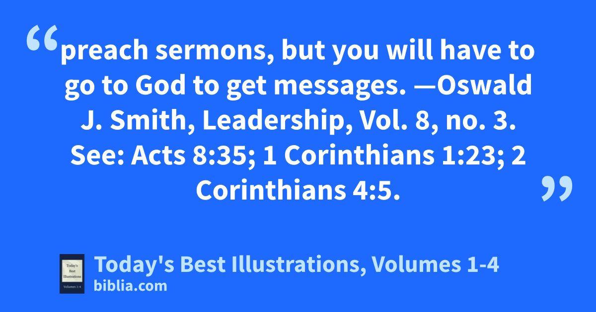 preach sermons, but you will have to go to God to get messages. —Oswald J. Smith, Leadership, Vol. 8, no. 3. See: Acts 8:35; 1 Corinthians 1:23; 2 Corinthians 4:5.