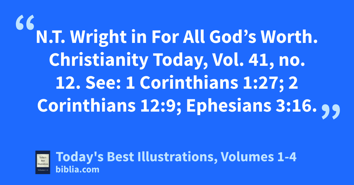 N.T. Wright in For All God’s Worth. Christianity Today, Vol. 41, no. 12. See: 1 Corinthians 1:27; 2 Corinthians 12:9; Ephesians 3:16.