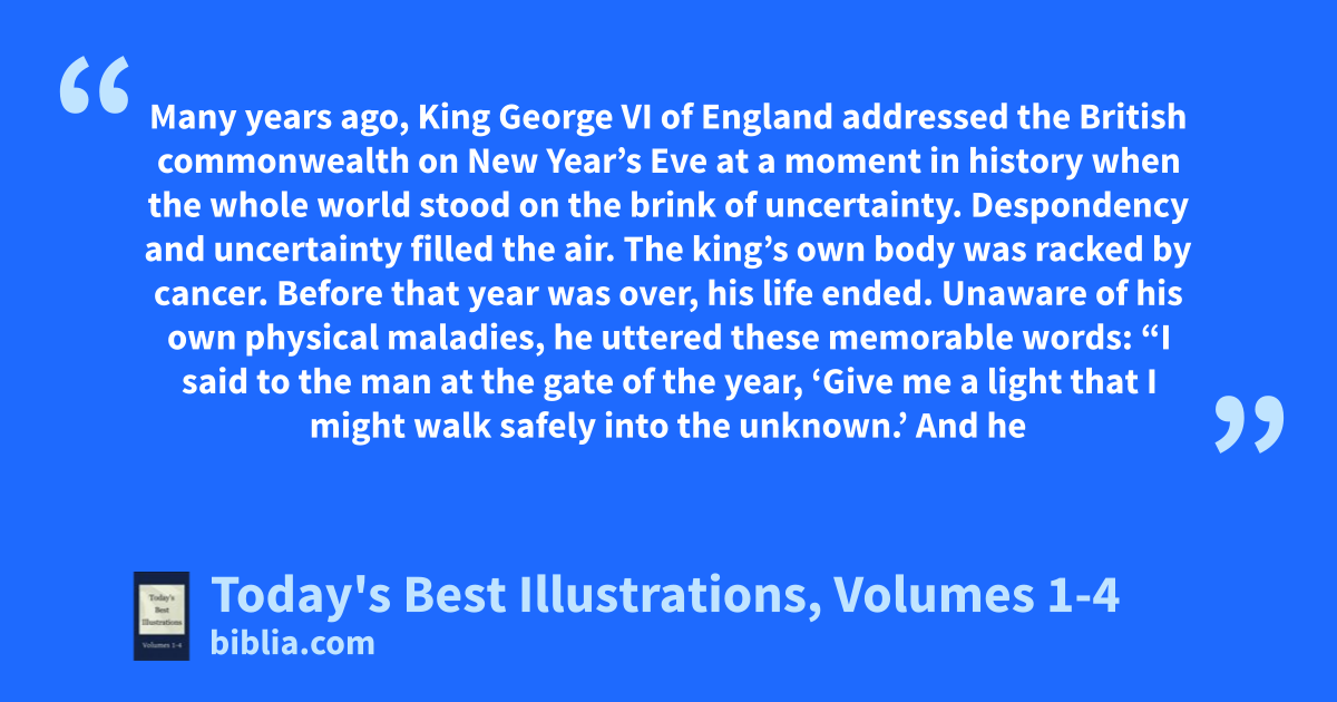 Many years ago, King George VI of England addressed the British commonwealth on New Year’s Eve at a moment in history when the whole world stood on the brink of uncertainty. Despondency and uncertainty filled the air. The king’s own body was racked by cancer. Before that year was over, his life ended. Unaware of his own physical maladies, he uttered these memorable words: “I said to the man at the gate of the year, ‘Give me a light that I might walk safely into the unknown.’ And he