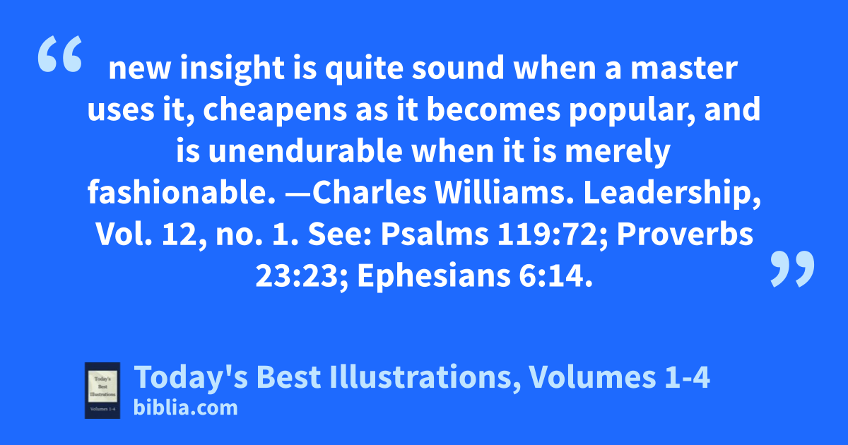 new insight is quite sound when a master uses it, cheapens as it becomes popular, and is unendurable when it is merely fashionable. —Charles Williams. Leadership, Vol. 12, no. 1. See: Psalms 119:72; Proverbs 23:23; Ephesians 6:14.